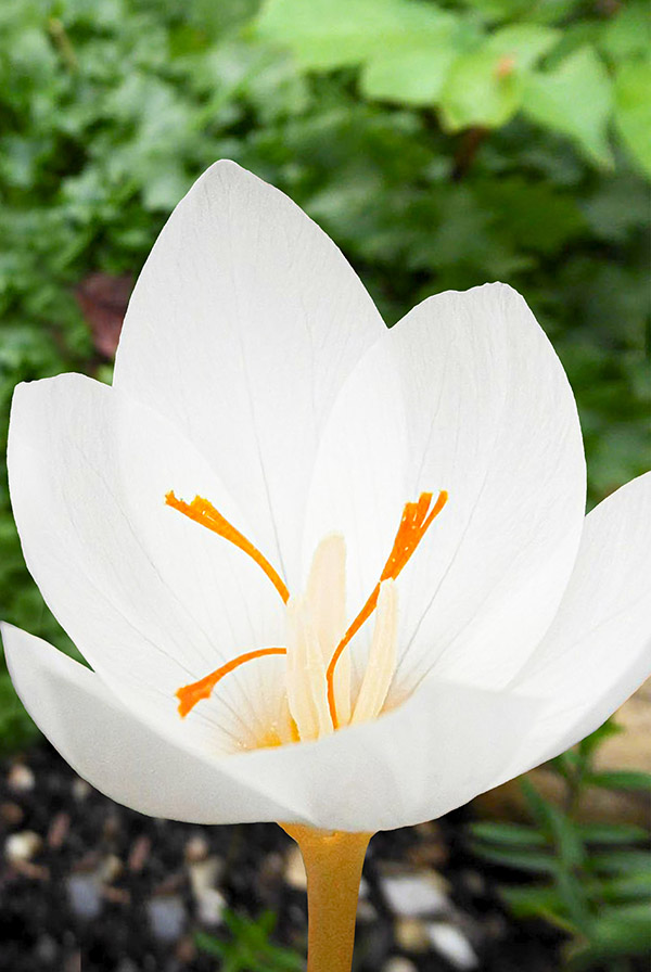 Красивый цветок, бокаловидной формы. Лепестки широкие, к кончикам заостренные. Они окрашены в белоснежные оттенки. В центре бутона расположились ярко-оранжевые тычинки, которые добавляют яркости.