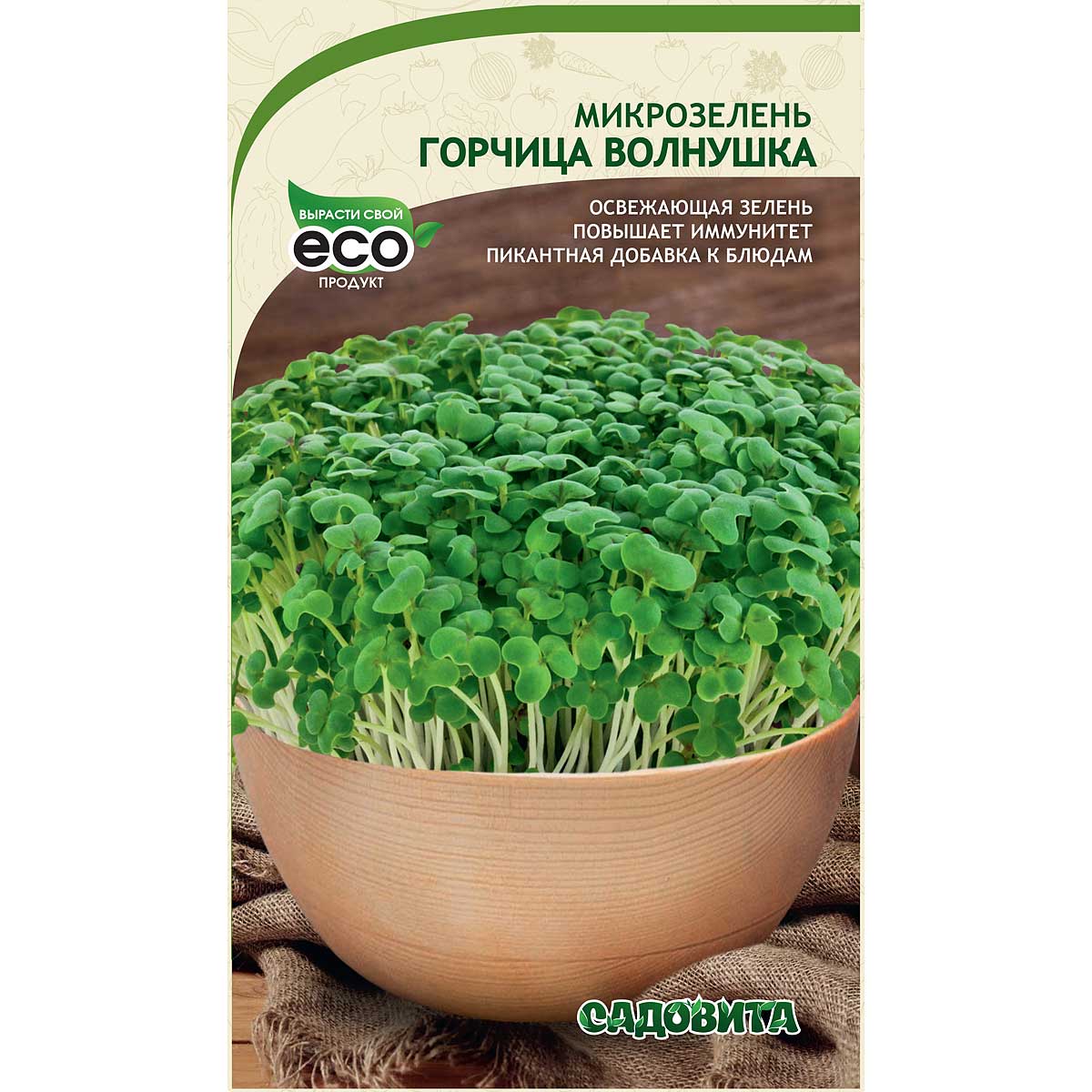 Микрозелень листовой горчицы – нежная и освежающая добавка к любым кулинарным блюдам. Листочки ярко-зеленые, в форме сердечек, с белыми стебельками. Вкус пикантный с небольшой остротой. Зелень стимулирует аппетит, ускоряет процессы пищеварения, повышает иммунитет, способствует очищению организма. Ростки горчицы содержат полезные полиненасыщенные кислоты, макро- и микроэлементы. Применение широкое - в качестве пикантной добавки к мясным блюдам, салатам. Инструкция: Равномерно распределите семена на субстрат, смочите водой и закройте крышкой на 1-2 дня до момента прорастания. После крышку можно убрать и поместить в солнечное место. Семена прорастают быстро, собирать урожай можно через 10-12 дней.