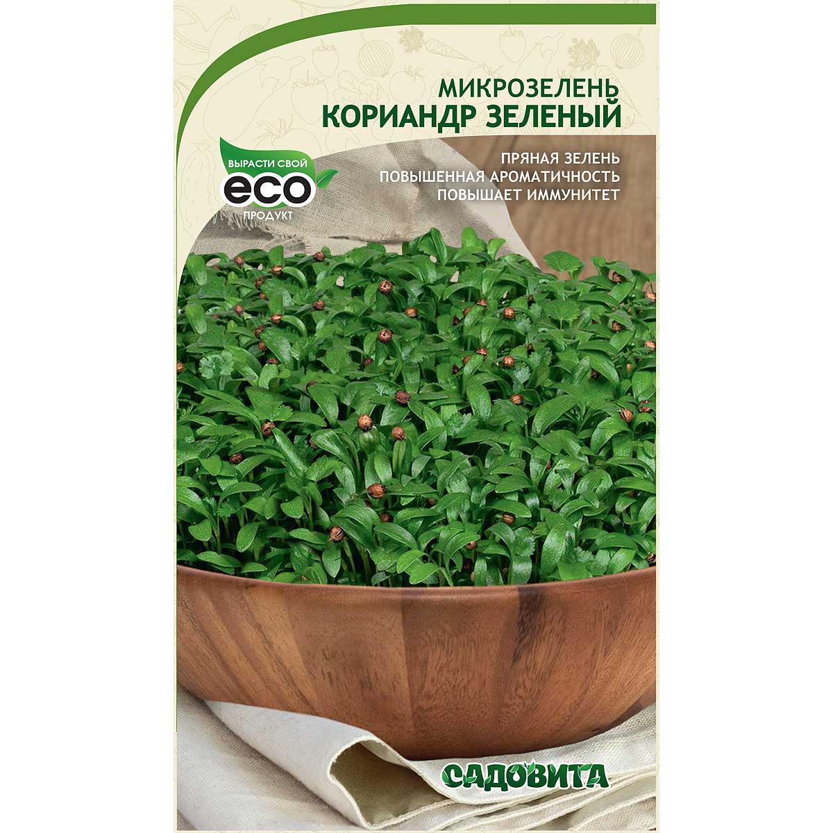 Микрозелень кориандра – яркая и пикантная зелень, содержащая в 3 раза больше витаминов, чем взрослые растения. Зелень нежная, светло-зеленая с пряным вкусом и ароматом. Является источником антиоксидантов, витаминов, минералов, бета-каротина. Микрозелень кориандра обладает общеукрепляющим эффектом, очищает организм, снижает уровень сахара и холестерина, нормализует работу сердечнососудистой системы. Применение универсальное – салаты, бутерброды, украшение различных блюд. Инструкция: Равномерно распределите семена на субстрат, смочите водой и закройте крышкой на 1-2 дня до момента прорастания. После крышку можно убрать и поместить в солнечное место. Семена прорастают через 14-18 дней после посадки.