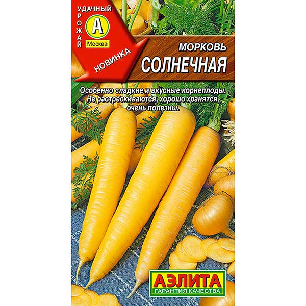 Среднеспелый сорт моркови с красивыми, ровными корнеплодами эффектного лимонного оттенка. Но не только яркая внешность выделяет его среди конкурентов, а завидный вкус и незаменимая польза для здоровья. Урожай созревает через 100-110 дней от всходов. Средняя масса корнеплодов 120-150 г (отдельные до 200 г). Мякоть особенно сладкая и вкусная, богата лютеином (для зрения) и ксантофиллом (против рака), сердцевина нежная. Сорт устойчив к цветушности и растрескиванию корнеплодов. Подходит для свежего употребления, домашних заготовок и хранения.