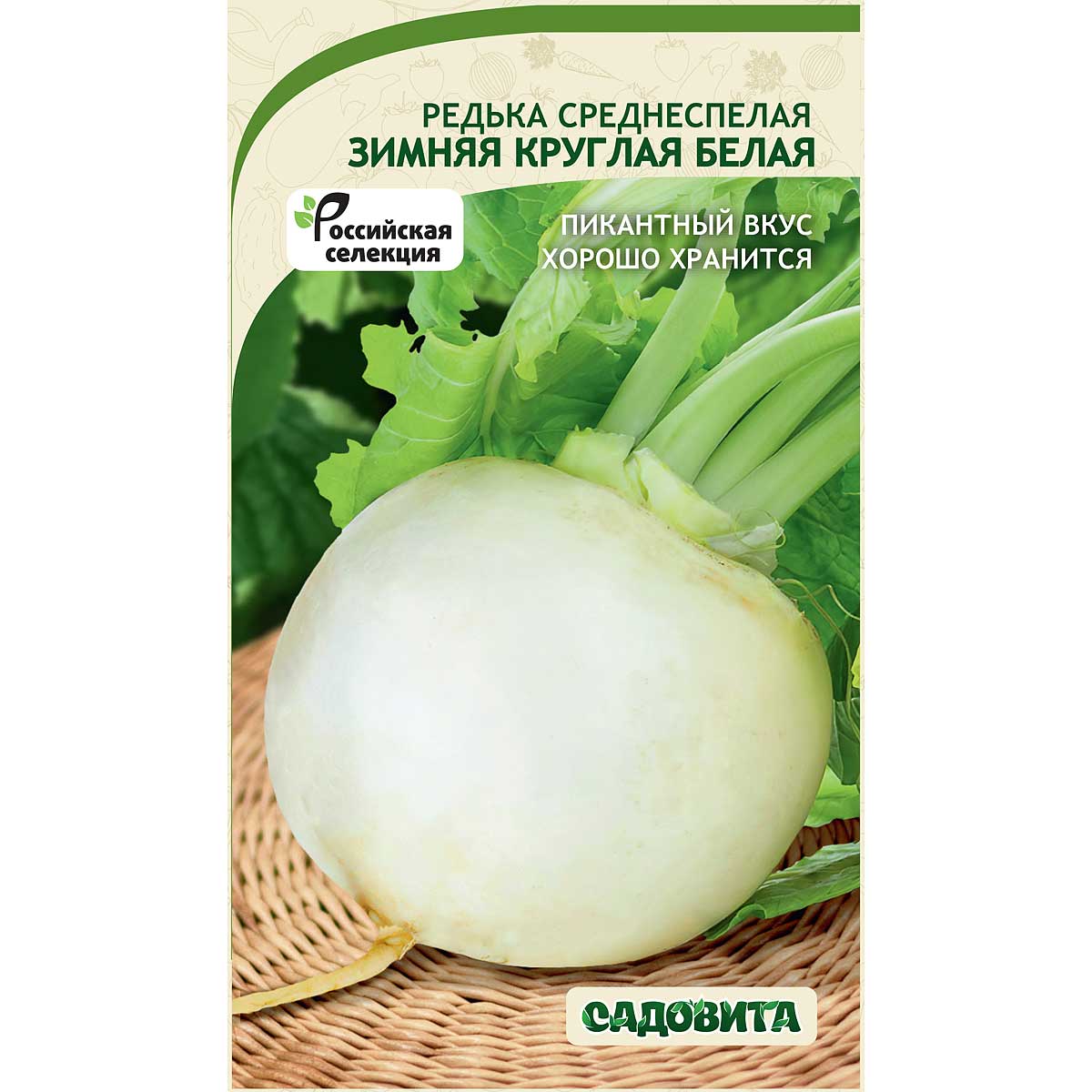 Урожайный среднеспелый сорт редьки. От полных всходов до технической спелости 70-93 дня. Листовая розетка раскидистая. Корнеплод белый, сверху со светло-зеленой пигментацией, округлой формы, гладкий, диаметром 8-10 см. Масса плода 250-450 гр. Корнеплод полностью погружен в почву. Хорошо выдергивается. Мякоть белая, плотная, сочная, приятного слабо-острого вкуса. Урожай отличается хорошей лежкостью в период зимнего хранения. Рекомендуется для использования в свежем виде (салаты, закуски). Урожайность высокая - до 6 кг с 1 кв.м.