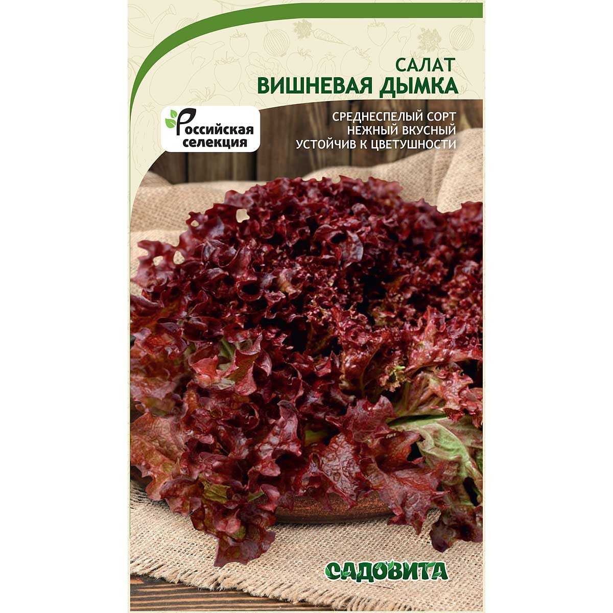 Среднеспелый сорт полукочанного салата. Период от всходов до сбора урожая составляет 50-60 дней. Рекомендуется для выращивания в открытом грунте и теплицах. Возможен многократный посев в течение сезона. Листовая розетка приподнятая, диаметром до 30 см. Лист пузырчатый с волнистым краем, хрустящий. Окраска двухцветная – зеленый с темно-вишневой каймой. Вкус нежный, с повышенным содержанием йода. Масса одного растения достигает 200-270 гр. Сорт устойчив к цветушности, отличается быстрым ростом при любой длине дня. Применение широкое - свежие салаты, декорирование различных блюд. Урожайность хорошая – 2-2,5 кг с 1 кв.м.
