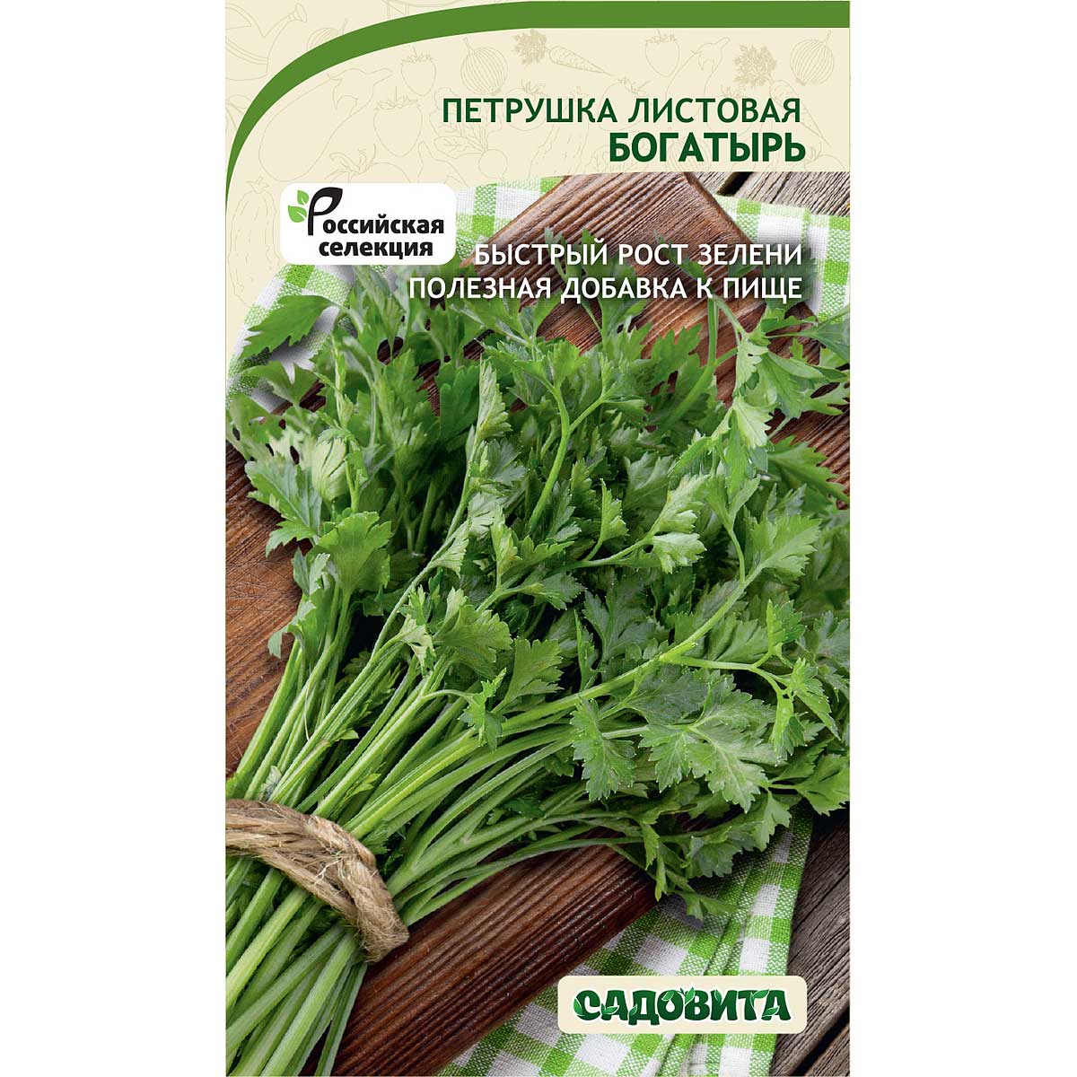 Среднеспелый холодоустойчивый сорт листовой петрушки. Срок созревания составляет 70-90 дней от всходов. Растение мощное, высотой 40-60 см. Листья треугольной формы, ярко-зеленые, обладают приятным ароматом и вкусом. Сорт ценится за высокую урожайность (до 3 кг зелени с 1 кв.м.), за устойчивость к засухе и заморозкам и за быстрый рост зелени. Благодаря прекрасным вкусовым качествам широко применяется в кулинарии для украшения блюд и в качестве приправы, также как витаминная добавка в свежие салаты.