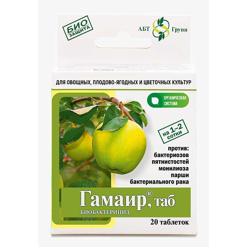 Гамаир, таб - биологический бактерицид и фунгицид на основе полезной природной бактерии Bacillus subtilis М – 22 ВИЗР, предотвращающий развитие пятнистостей на листьях, бактериальных гнилей, парши, монилиоза, бактериального рака, сосудистого и слизистого бактериозов.