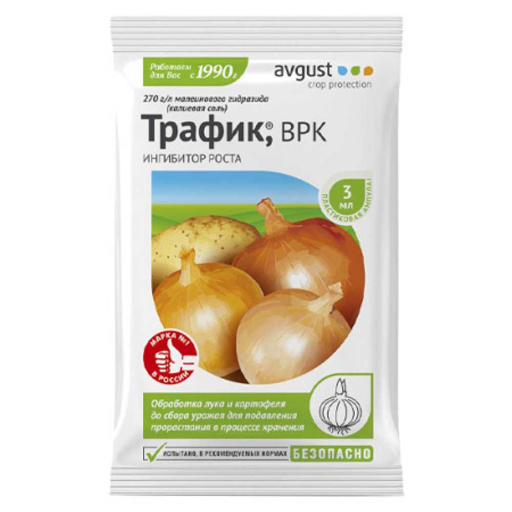 Трафик - регулятор роста против прорастания лука и картофеля во время хранения. Применяется путём опрыскивания растений в период вегетации за 14-25 дней до сбора урожая. Обеспечивает сохранность качества лука и картофеля с момента обработки до уборки, а затем при хранении продукции на срок до 9 месяцев. Не допускает образование проростков. Проявляет активное действие уже через 24 часа после обработки. Способствует повышению устойчивости лука и картофеля к болезням в процессе хранения. Для приготовления рабочей жидкости в бачок опрыскивателя налить воды на 1/2 объема, добавить необходимый объём препарата, долить воду до расчётного объёма и взболтать в течение 2-3 минут. Рабочую жидкость следует использовать в день приготовления. Для максимального эффекта обработку растений необходимо проводить в период их активного роста. У репчатого лука листья должны быть зелёными с активными тканями (полегание - не более 50%). У картофеля около 80% клубней должны иметь размер не менее 25 мм. Не рекомендуется обрабатывать растения в стрессовых ситуациях (засуха, болезни, вредители и т.д.).